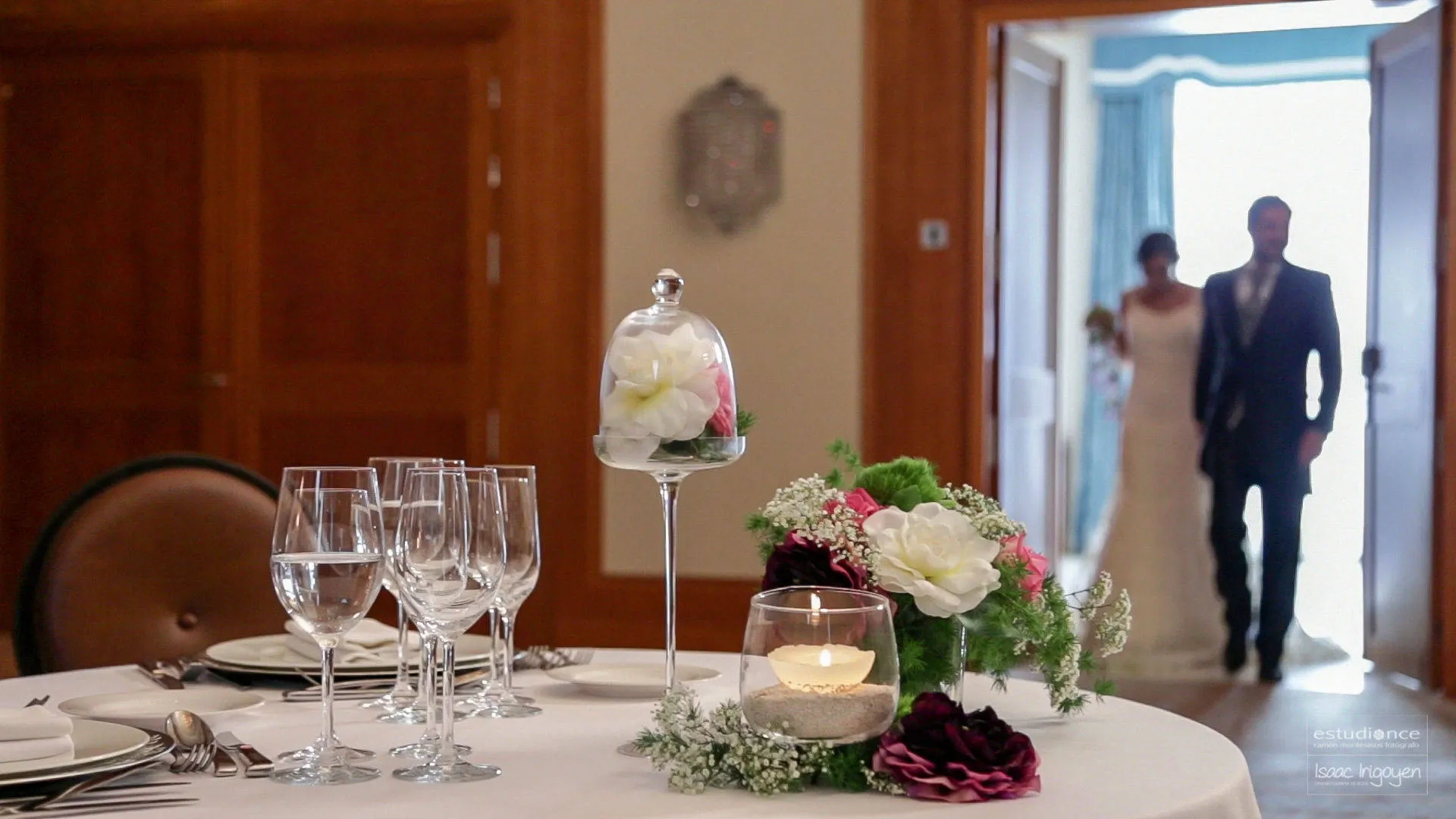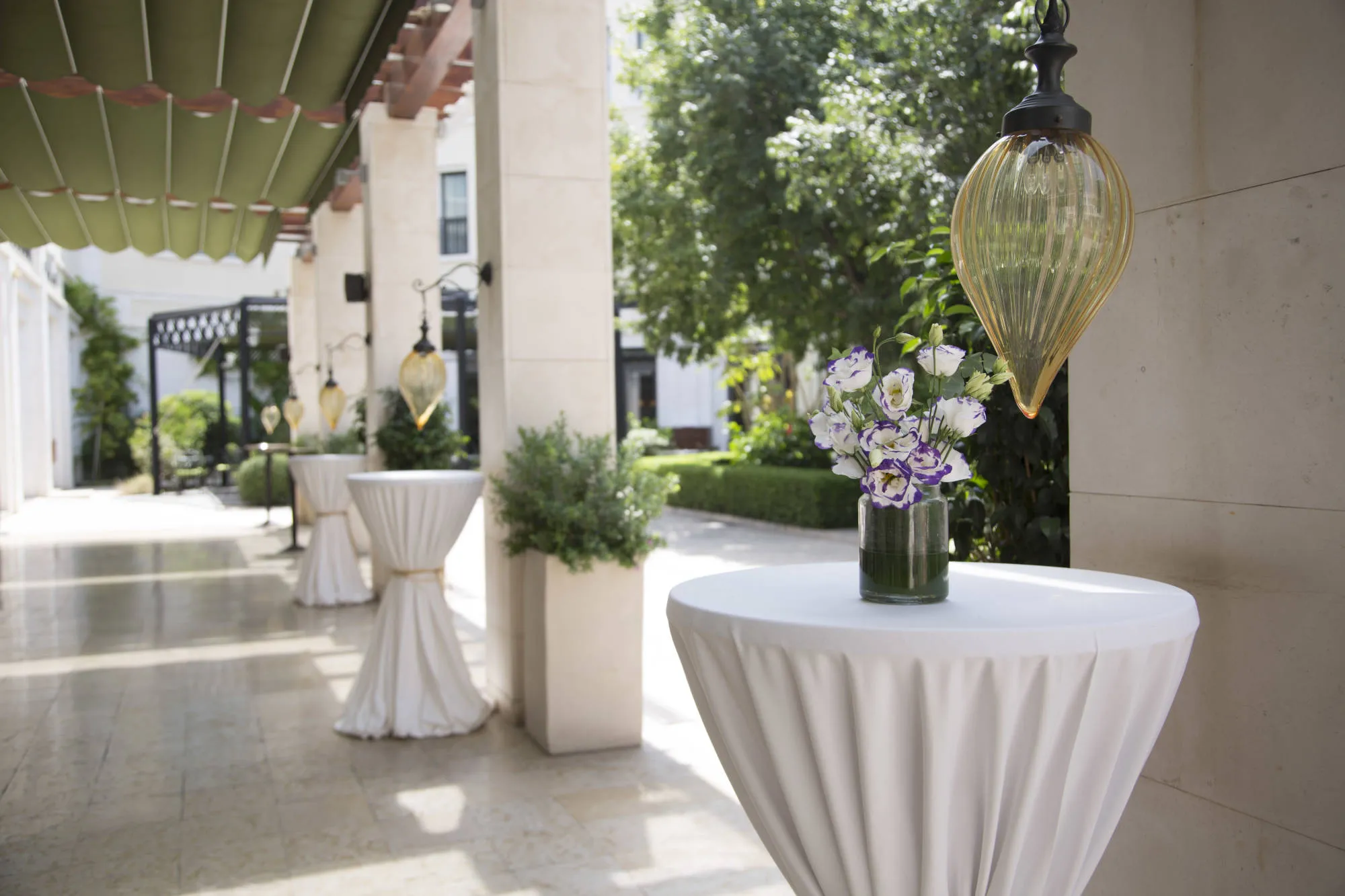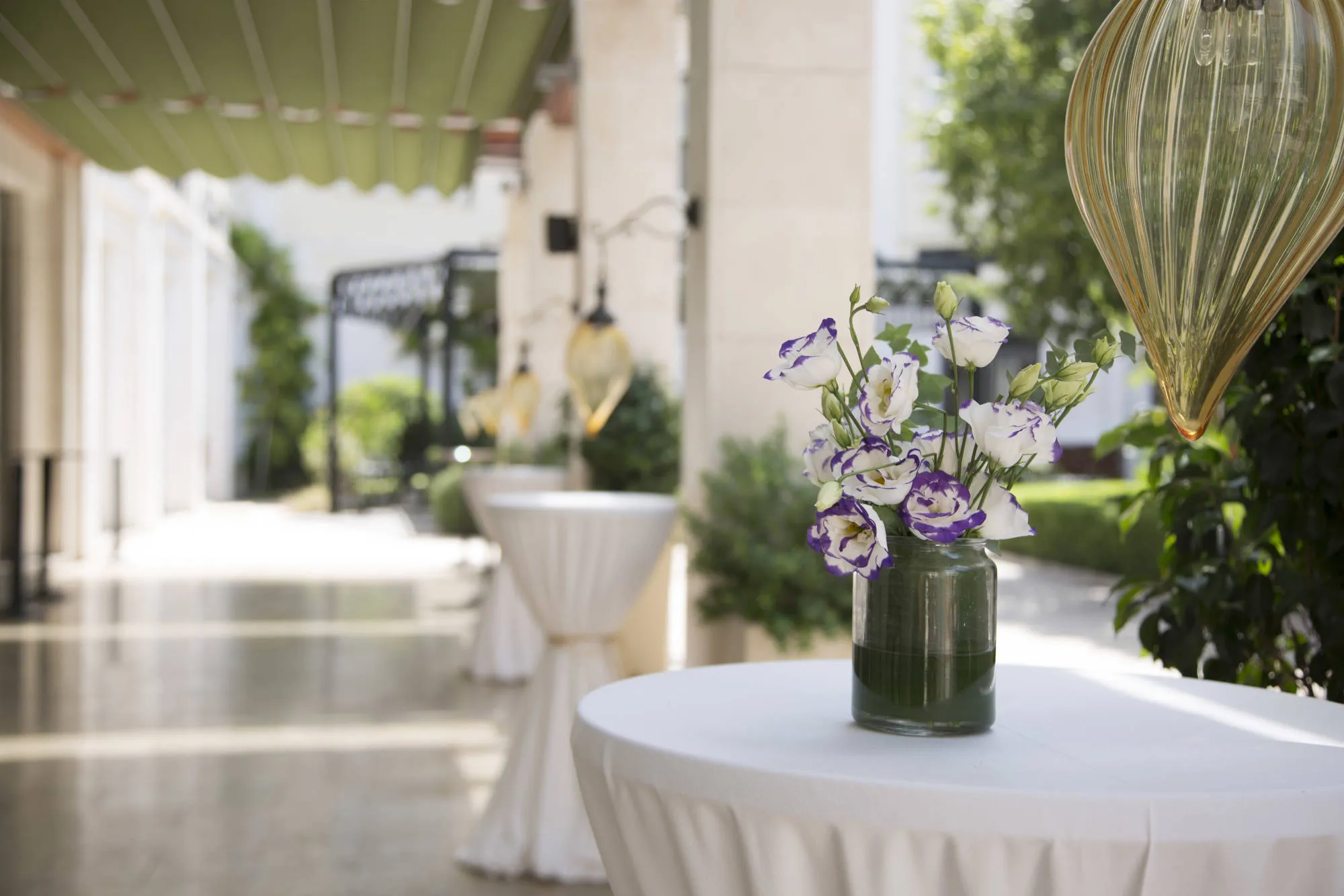 Step inside to a sophisticated and elegant ambiance. The grand hall boasts soaring ceilings, intricate chandeliers, and floor-to-ceiling windows bathing the space in light. The courtyard provides a romantic setting surrounded by lush greenery and the sound of water.